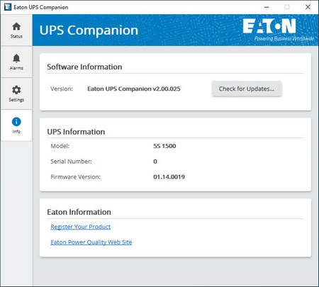 The info tab allows you to check for software updates (same as the settings one), check the firmware version and register your UPS.