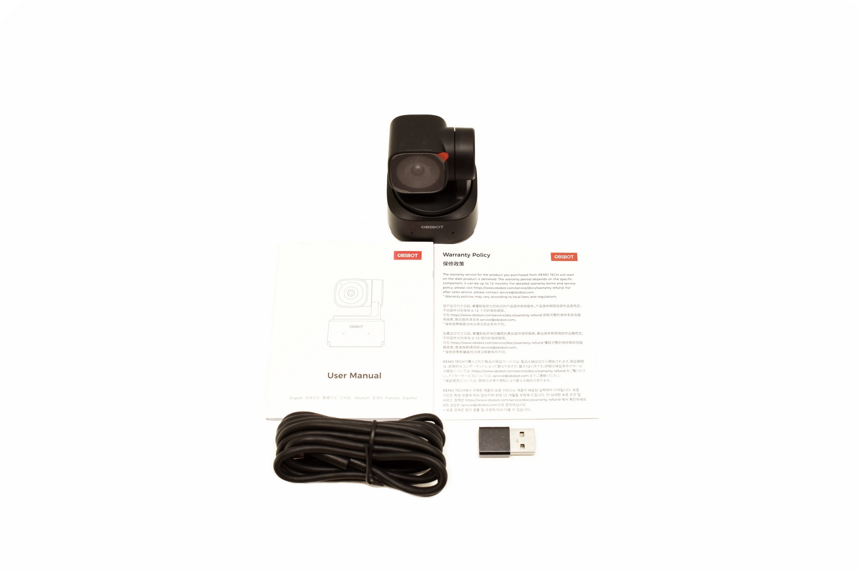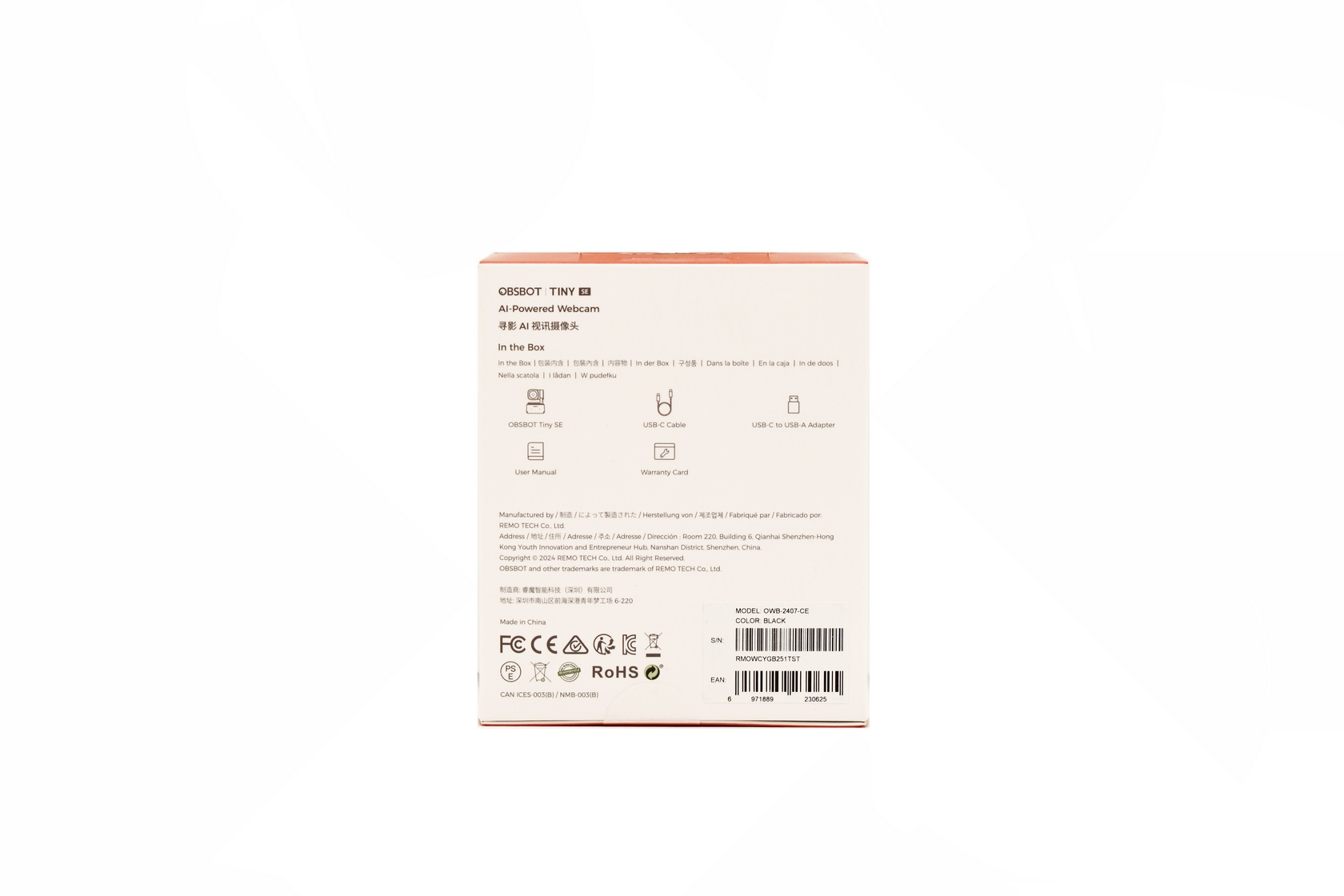 At the rear OBSBOT lists the bundle contents, company contact information and numerous certifications.