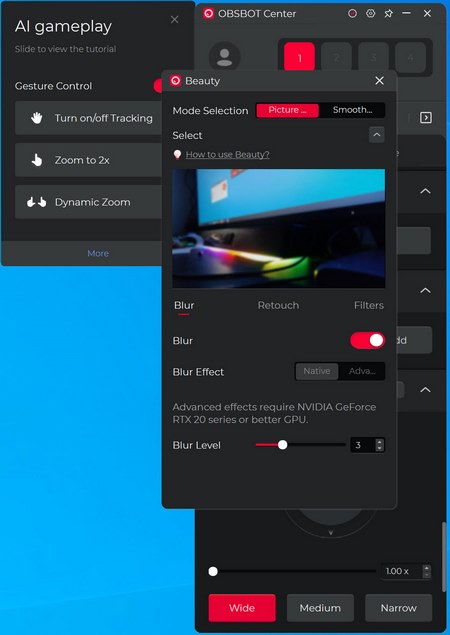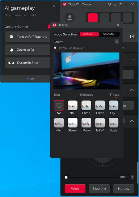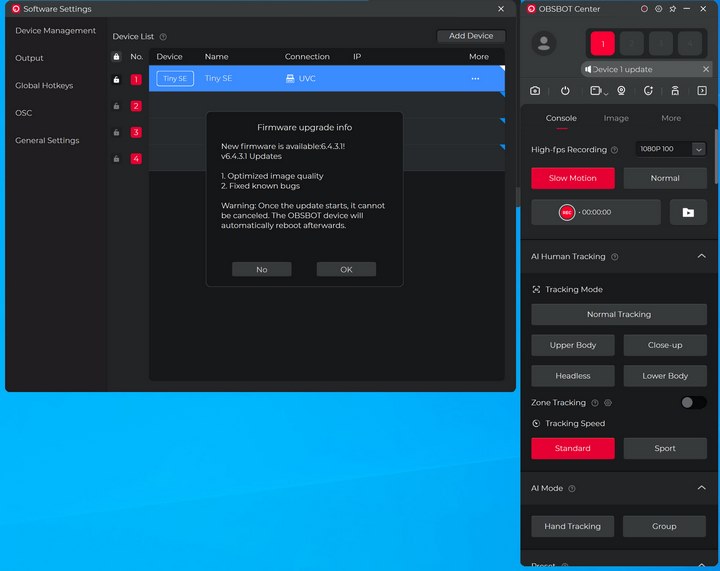 As with past reviews the first thing I checked when I launched the OBSBOT center software was for a firmware from within the settings tab.