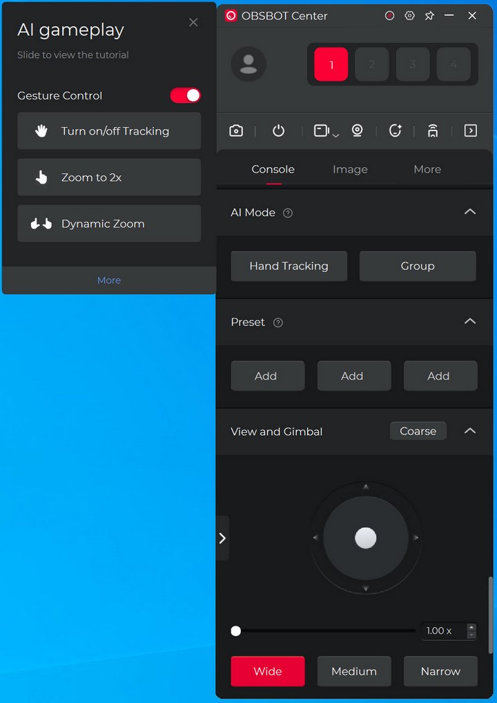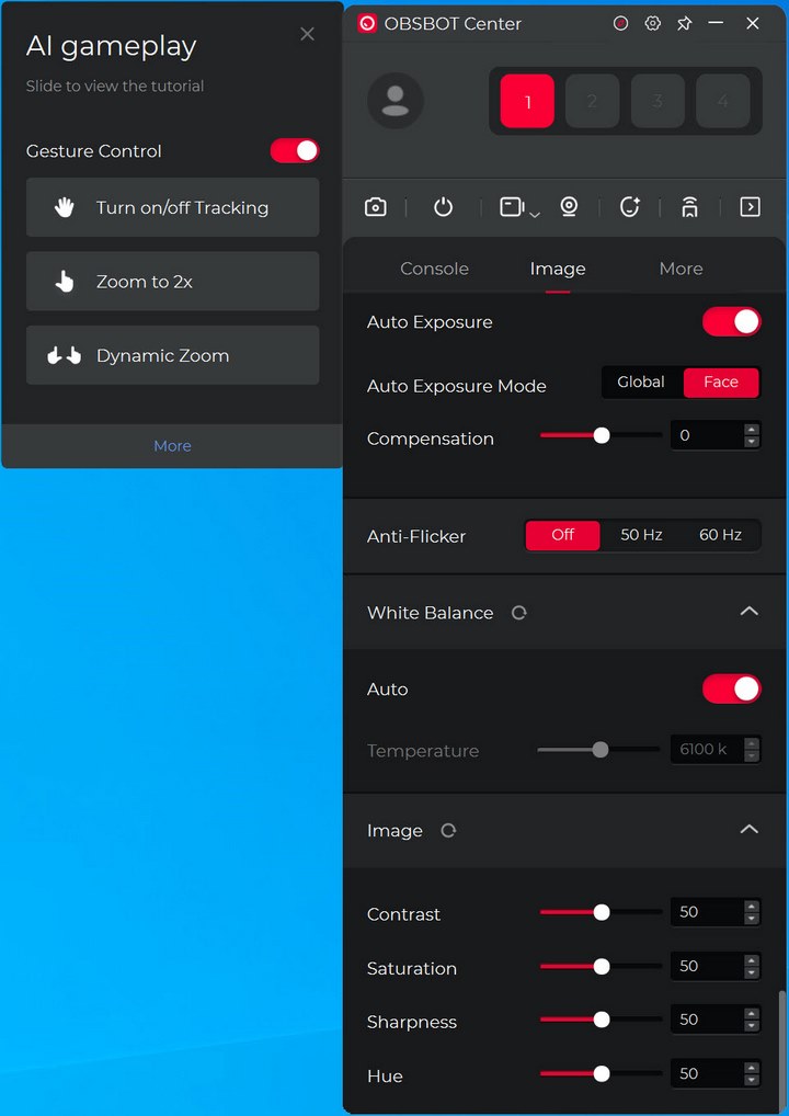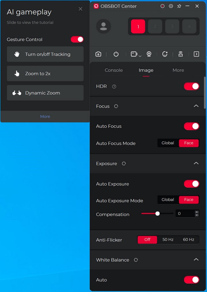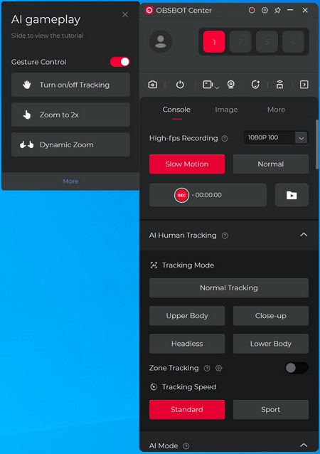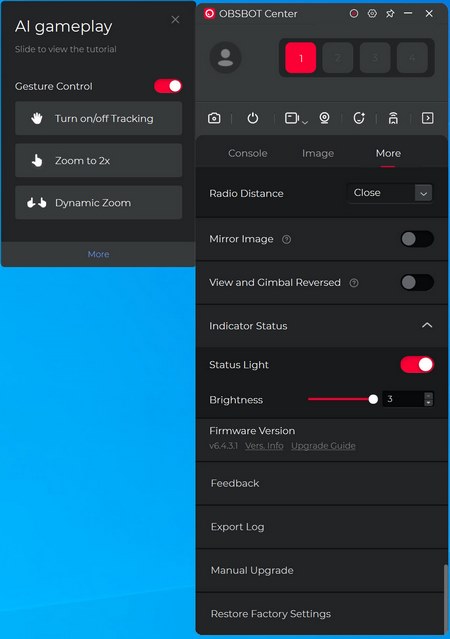 With the latest firmware install one tab I don't recall with past reviews is the A.I gameplay one. That aside the main software tab includes settings like high-fps recording, AI tracking, AI mode and manual PTZ use (also zoom).