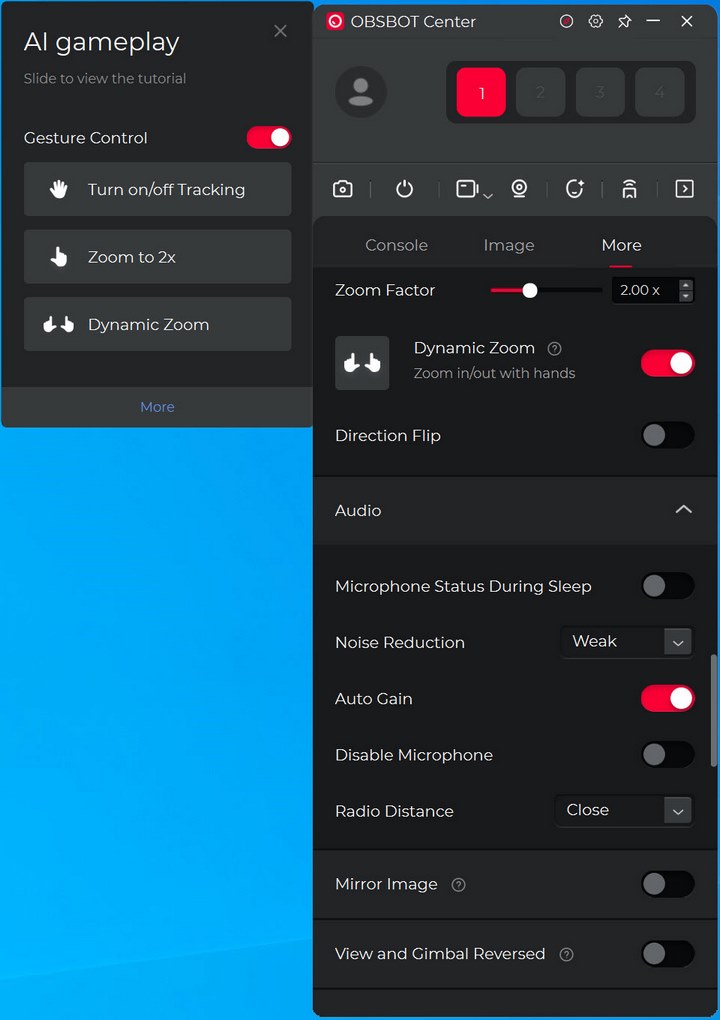 Settings like device initial state (orientation), device sleep, gestures, zoom, direction flip, microphone noise reduction and automatic gain, indicator settings, image flip and reverse view and gimbal are all inside the more tab (firmware upgrades and factory restore as well).