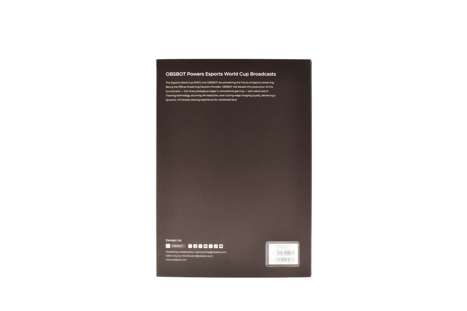 Removing the cover reveals the contents of the bundle and contact information for OBSBOT.