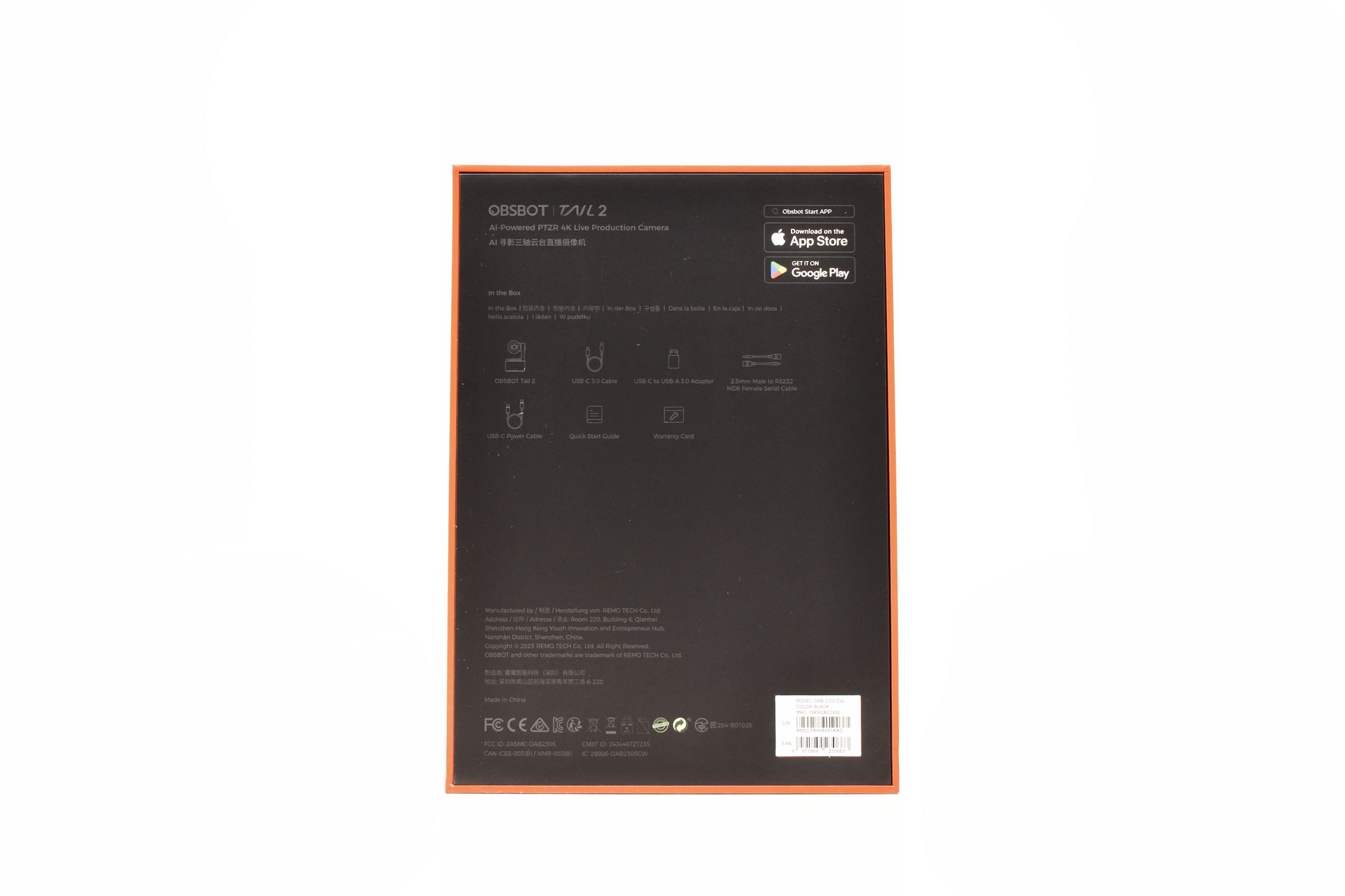 OBSBOT ships the Tail 2 inside a large box that has a cover the front of which is taken by a lens drawing and the company logo.