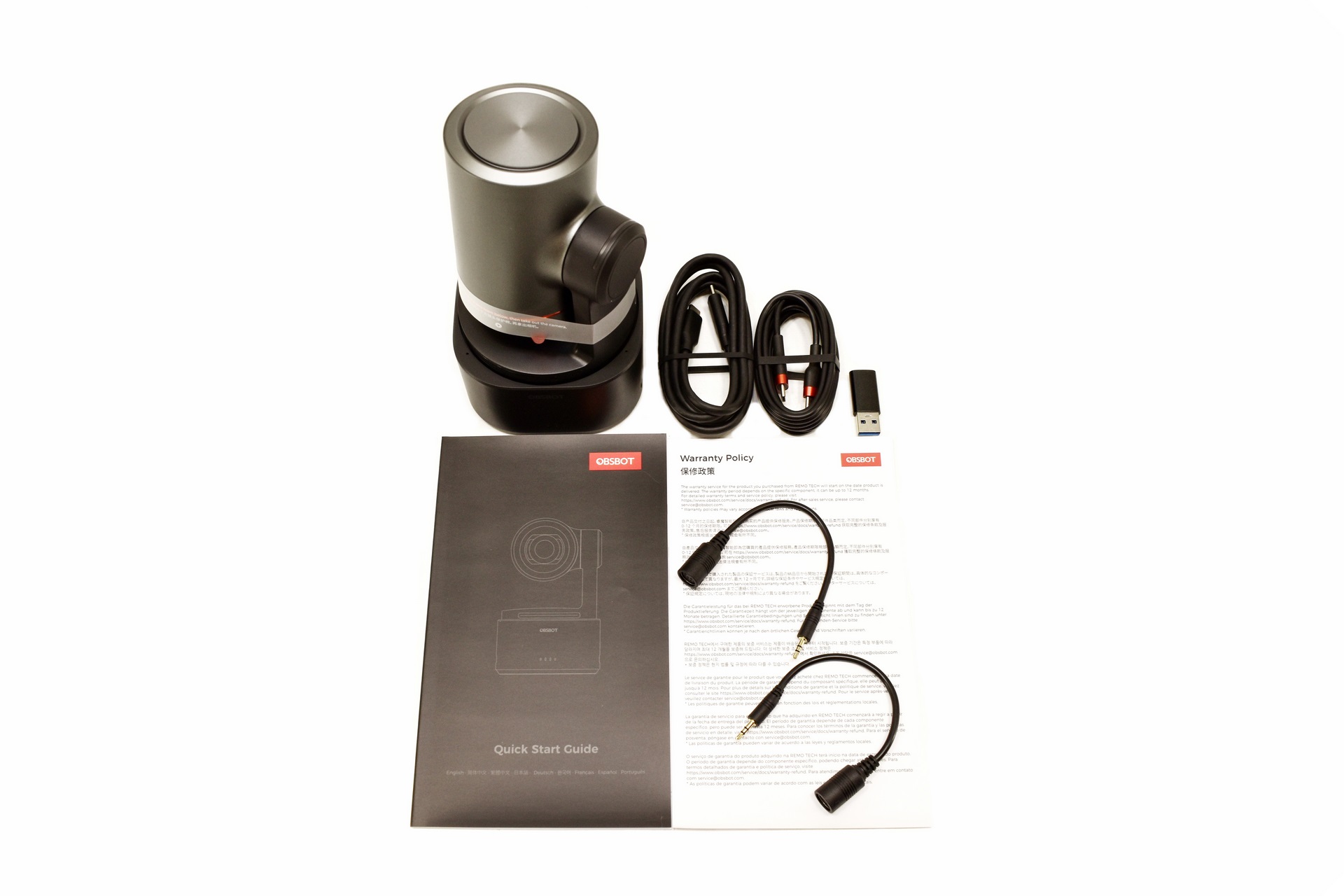 Aside the Tail 2 inside the box OBSBOT has also placed a USB-C data cable, USB-C power cable, USB-C to USB-A adapter, two 2.5mm to RS232 cables, warranty card and a quick start guide.