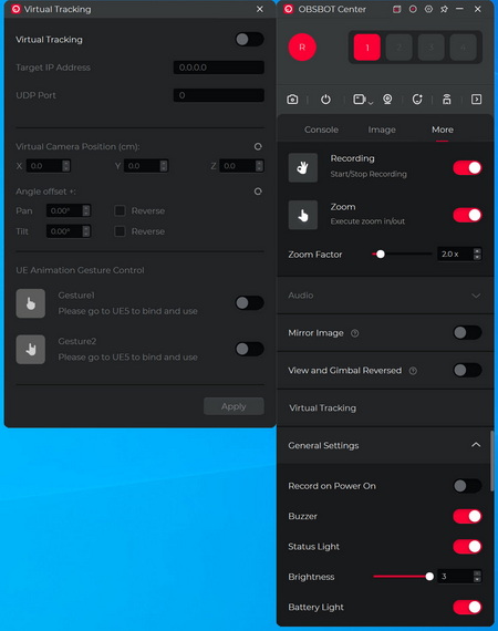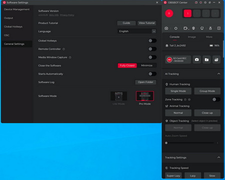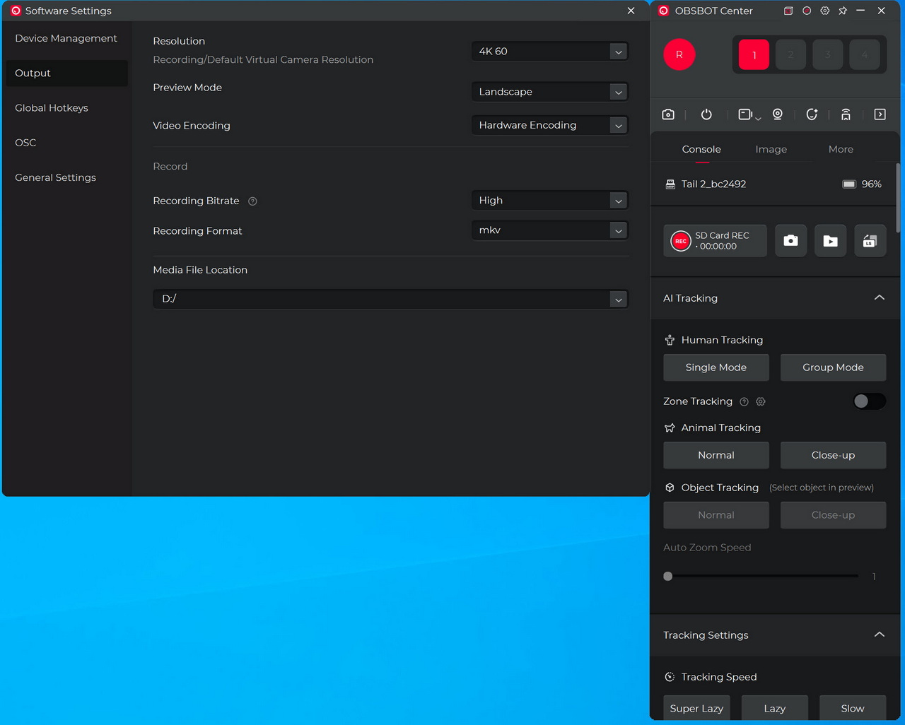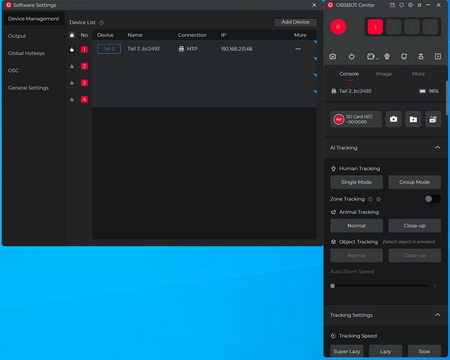 Inside the settings tab you can select the camera you’d like to control, adjust the output, set the global hotkeys, adjust the OSC and access the main settings as seen above.