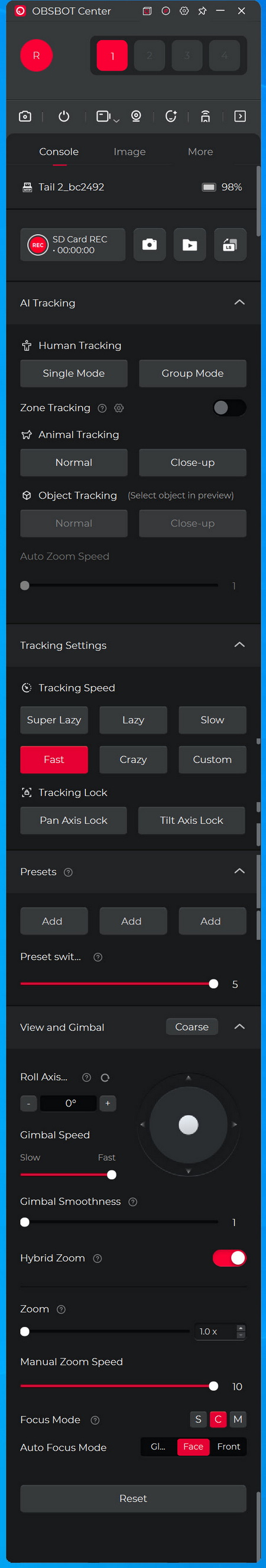 From the control tab you can see the Tail 2 remaining battery life, start recording, take pictures, playback recordings, set the tracking speed and mode, set the AI mode (animal tracking is very useful if you have pets), save your settings to different presets and use the PTZR and digital zoom functions.