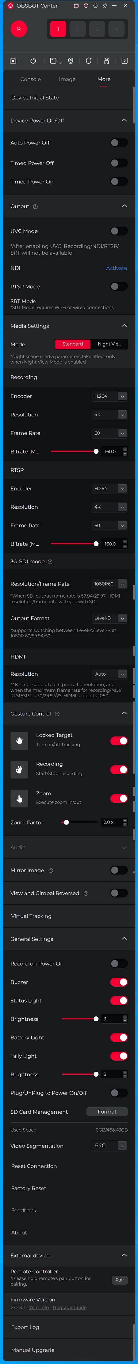 Settings like auto and timed power on/off, UVC/RTSP modes, recording settings (frame rate, codec, bitrate and resolution), 3G-SDI mode, HDMI output, gesture control, audio settings (volume, noise reduction and automatic gain), mirror image, pan-tilt controls, LED control, micro SD card management (format and video segmentation), feedback, settings reset and firmware updates are placed inside the more tab.