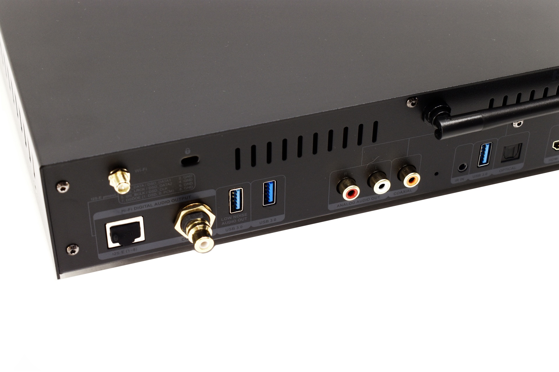 Moving at the rear we find 2 antenna ports, I2S-E RJ45 Hi-Fi out, coaxial connector, three USB 3.0 ports (one also doubles as low noise audio out), stereo RCA audio outputs, coaxial video output, IR extension input, Bluetooth Antenna, S/PDIF optical out, HDMI 2.1a out, RJ45 Gigabit ethernet port, power port with fuse and the on/off power button.
