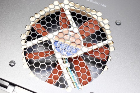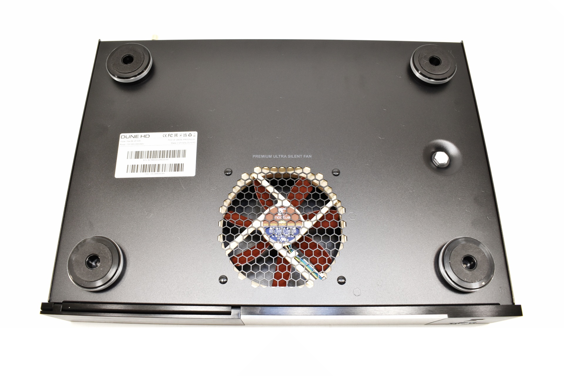 Turning the player over we find 4 large round feet and an 129mm exhaust fan.