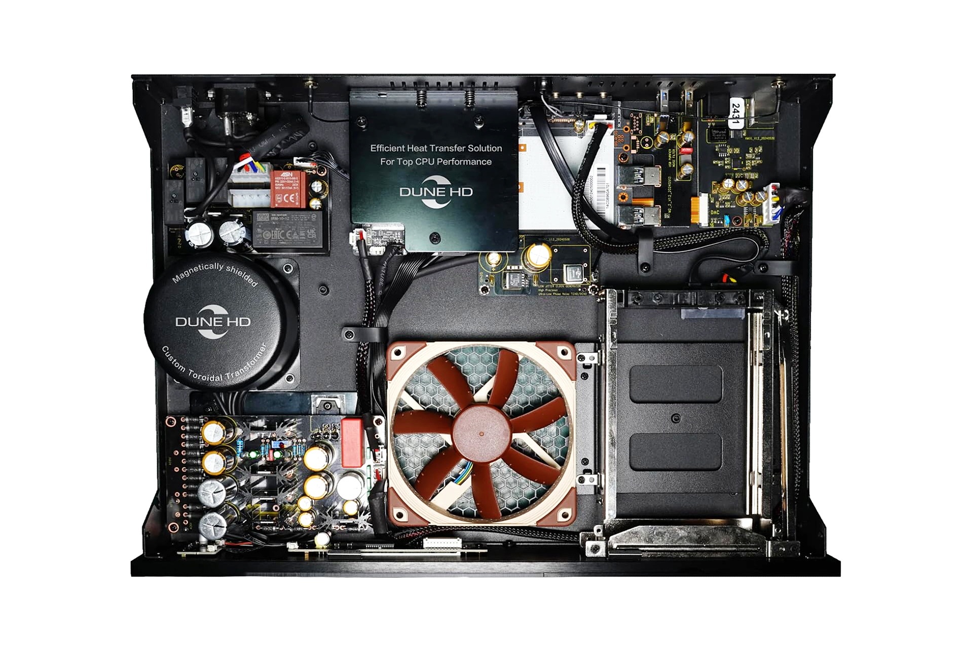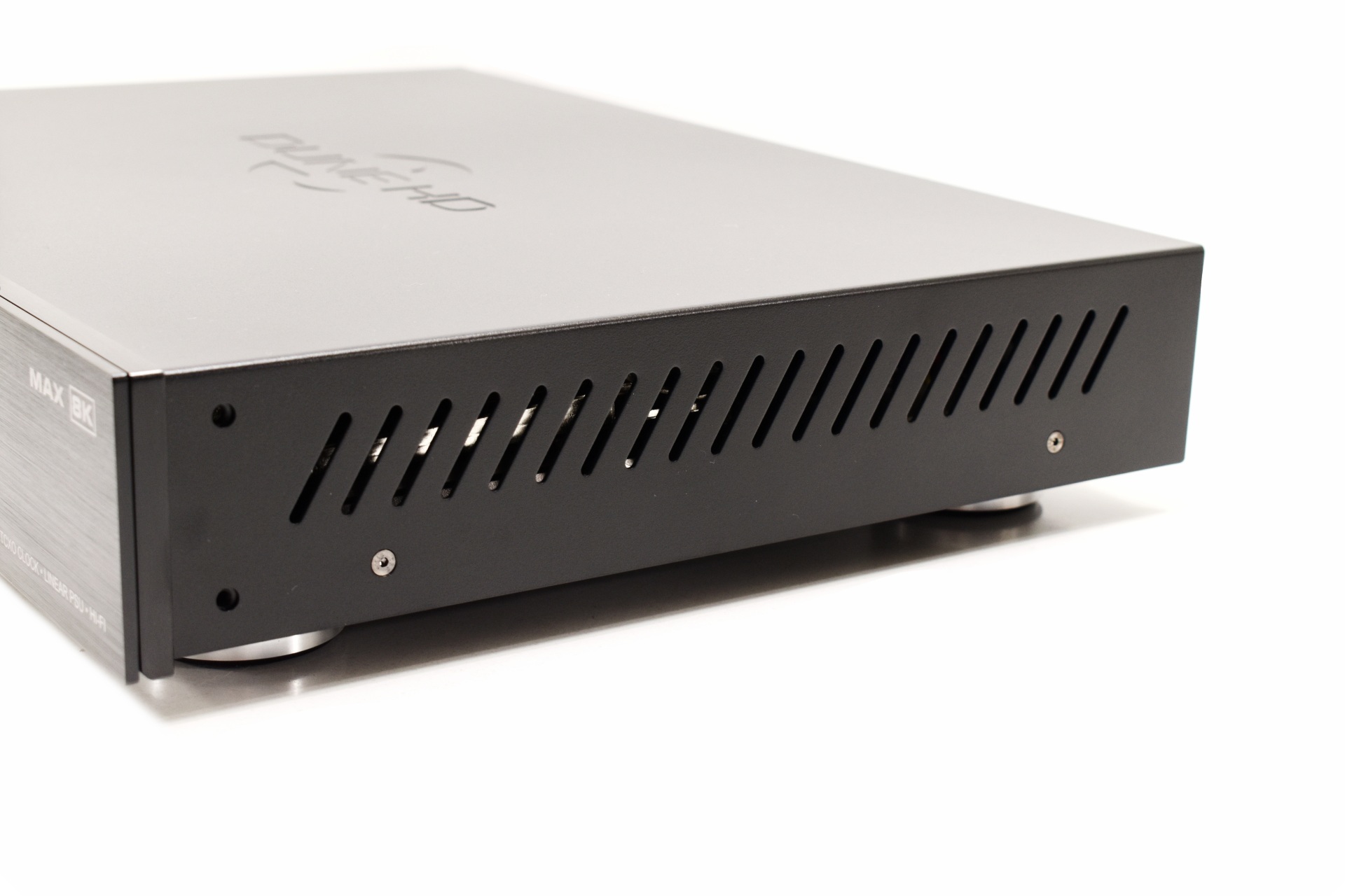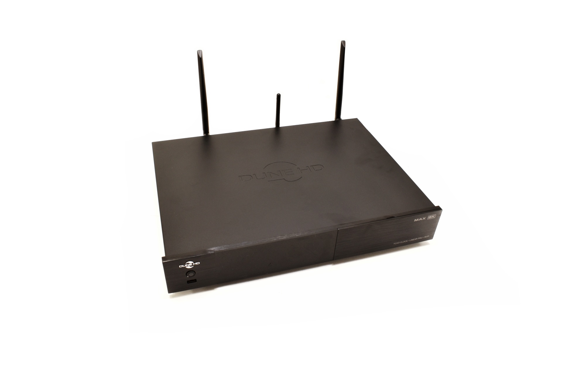 The Dune HD Max 8K is features an OS based on both Android TV v11 and Linux and is powered by the Amlogic S928X‑K/J processor (single Arm Cortex-A76 core, four Arm Cortex-A55 cores and Arm Mali-G57 MC2 3D GPU), a high‑performance chipset designed for demanding formats such as 8K output, AV1 decoding, Dolby Vision (VS10), HDR10+, and advanced HD audio. Its audio subsystem incorporates a Hi‑Fi digital output built around an XMOS processor, a manufacturer known for precision USB audio and low‑latency DSP handling. The full‑size chassis includes a 3.5″ HDD bay, a linear power supply with a toroidal transformer, and a TCXO ultra‑low‑noise clock to stabilize both audio and video timing. Cooling is handled by a Noctua NF‑S12A PWM fan, a premium model recognized for quiet operation and long‑term reliability. Connectivity covers Gigabit Ethernet, Wi‑Fi 6, Bluetooth v5.2, HDMI v2.1a, four USB ports (3xUSB 3.0 / 1xUSB 2.0), optical and coaxial S/PDIF, plus dedicated Hi‑Fi digital outputs depending on the configuration. With 8GB of RAM and 64GB of internal storage, the Max 8K by Dune HD is engineered for enthusiasts who want robust hardware, wide codec support, and flexible integration into high‑end home‑theater systems.