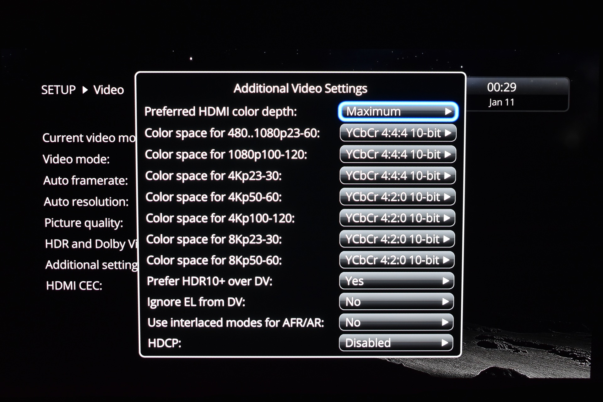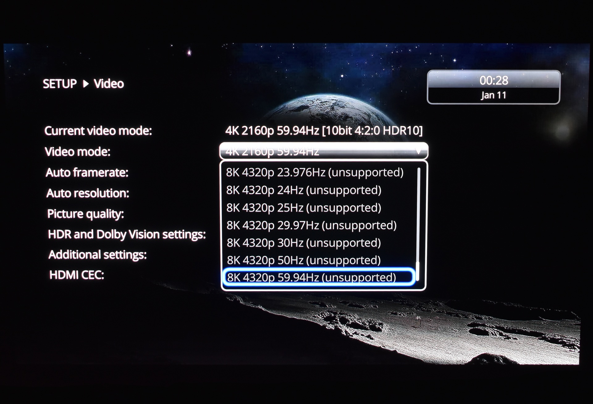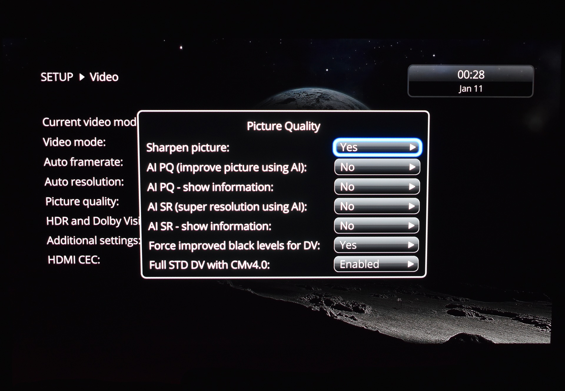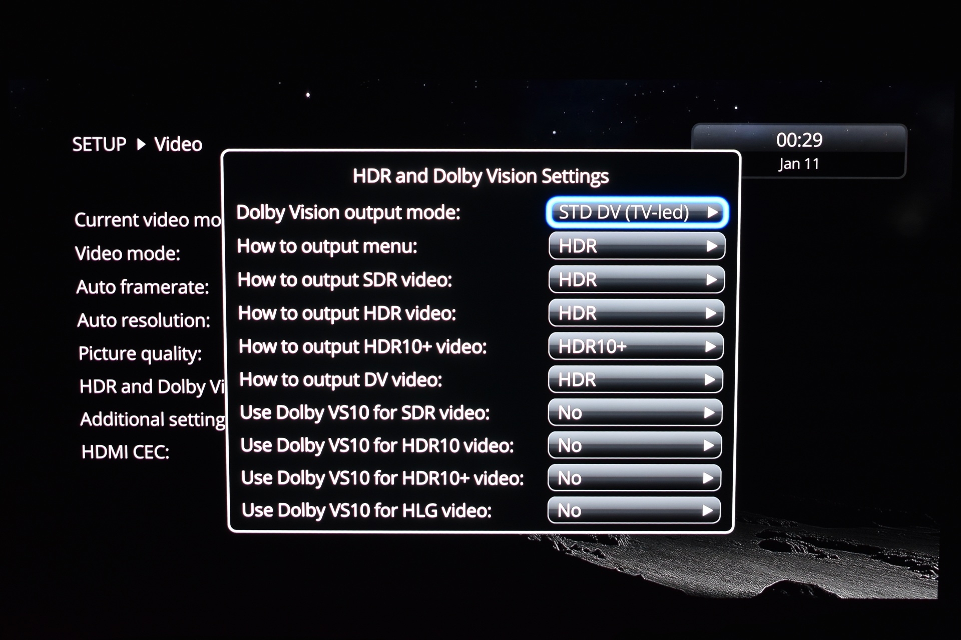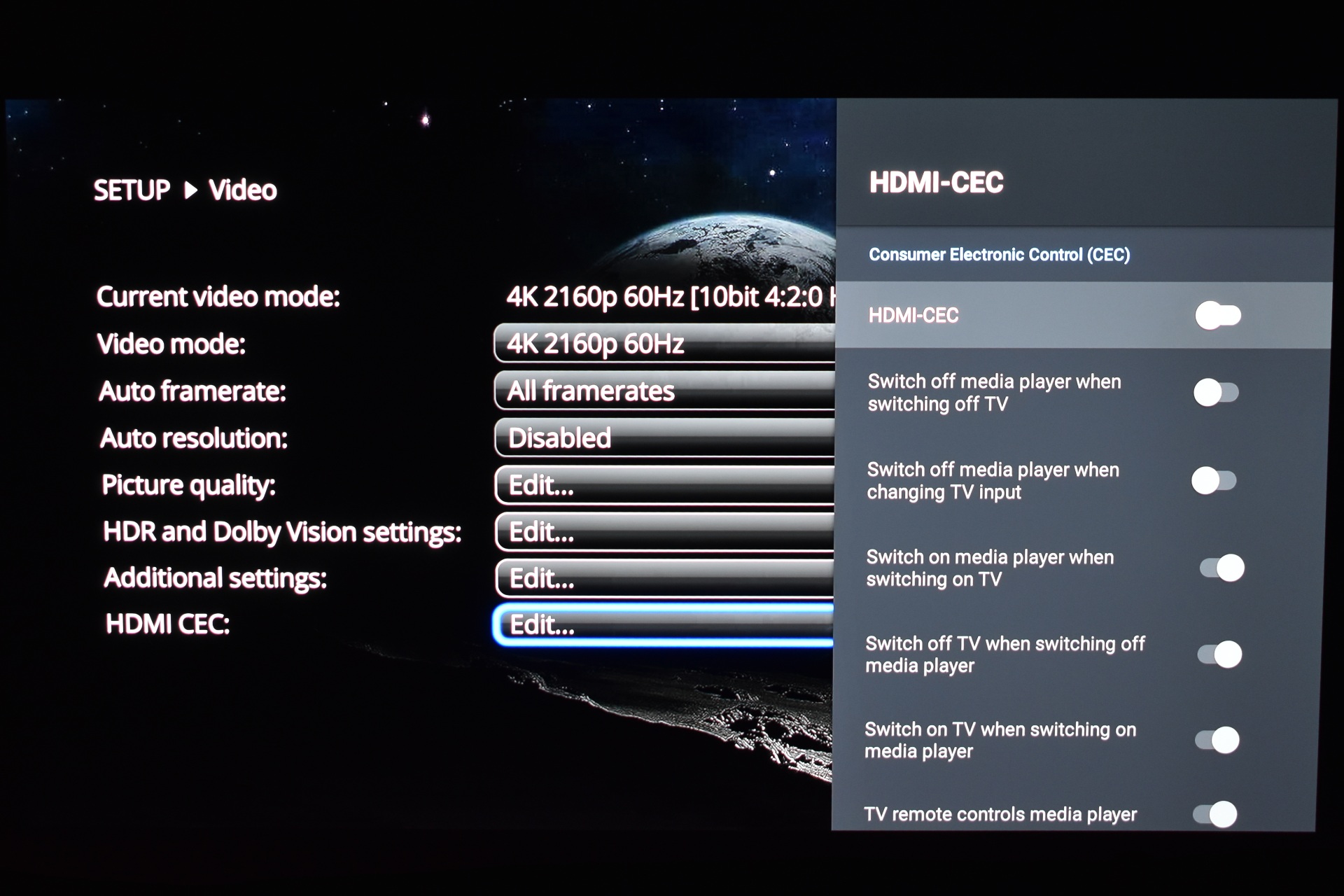 From the video tab you can change the resolution (up to 8K60), adjust framerate, enable auto resolution, use picture quality options (you'll need to test these to find the best result for your TV/Projector), adjust the HDR and DV settings (my Samsung 65" OLED uses HDR10+ so I had to change some of these), use additional video settings (color space related) and access the HDMI CEC android tab.