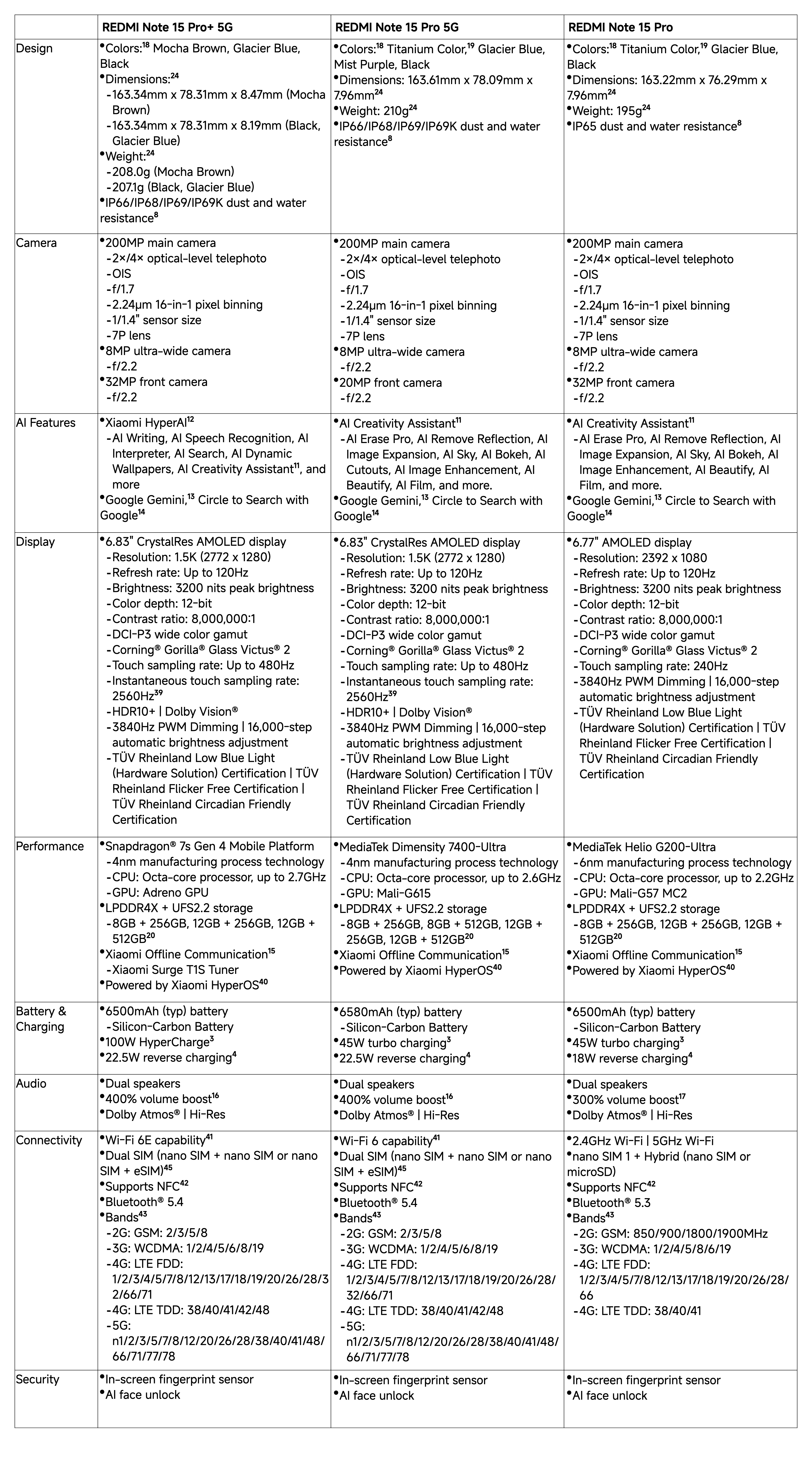 Complementing the display, REDMI Note 15 Pro+ 5G and REDMI Note 15 Pro 5G introduce a 400% volume boost,¹⁶ while the rest of the lineup offers a 300% volume boost, delivering louder, clearer audio for movies, music, and games.¹⁷