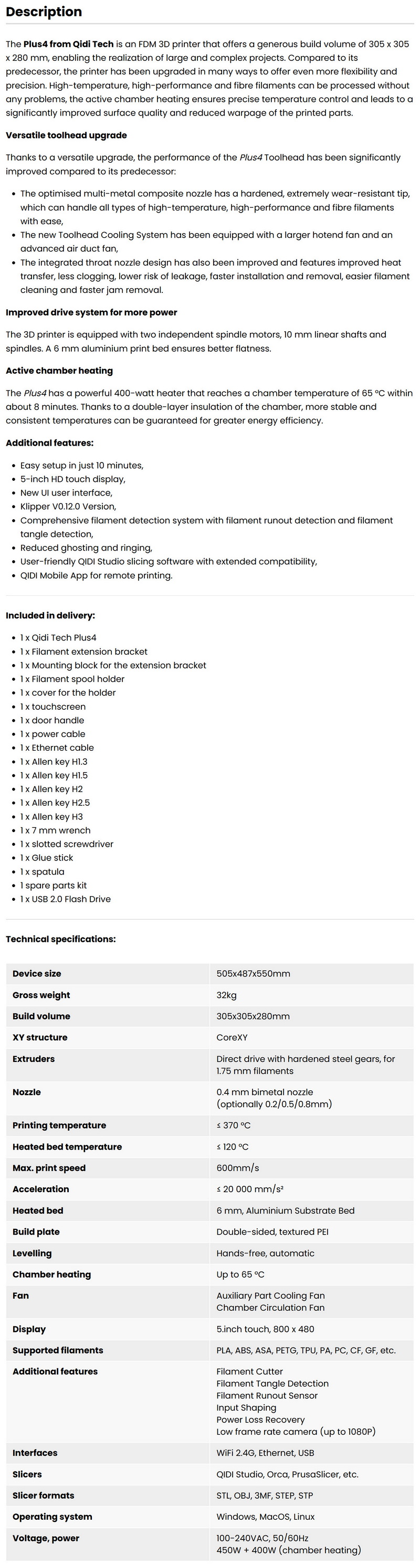 The QIDI Plus 4 comes in with a roomy 305x305x280mm build volume and a CoreXY motion system driven by 9mm belts for stability at high speeds. It’s rated for up to 600mm/s with acceleration up to 20,000mm/s², backed by input shaping and closed‑loop control to keep prints clean even when pushing it. The direct‑drive extruder can reach temperatures of up to 370°C, letting it handle tougher materials like Nylon, ABS, ASA, PETG, TPU, and carbon‑ or glass‑fiber composites. A second‑generation actively heated chamber climbs to 65°C, which helps reduce warping on engineering filaments. The dual‑sided textured PEI plate makes part removal painless, and the fully automatic leveling system keeps setup hands‑off. QIDI also features an 5-inch 800x480 touch screen, Wi-Fi 2.4GHz connectivity, USB port, Ethernet RJ45 port, filament runout and tangle detection (quad filament box is also supported), and an auxiliary part‑cooling fan for sharper details. The machine runs on Windows, macOS, or Linux and supports STL, OBJ, and 3MF files. With a solid metal frame, dual Z‑axis lead screws, and a carbon‑filtered circulation fan, it’s clearly built for reliability. All of this comes wrapped in a chassis that feels more industrial than hobby‑grade.