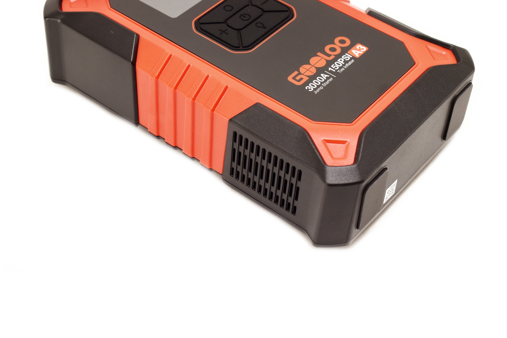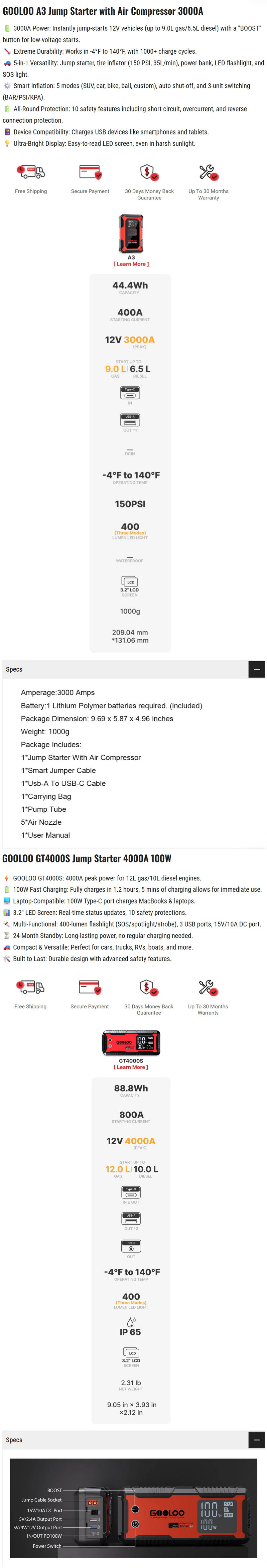 The Gooloo A3 centers its versatility around a 44.4Wh battery, delivering 3000A peak current, a 150 PSI tire inflator (5 modes), USB power outputs, and emergency LED lighting (400 lumen), all managed through a 3.2″ LCD screen that gives clear, real‑time status feedback. That energy reserve supports multiple jump‑starts and inflation cycles while handling engines up to 9.0L gas / 6.5L diesel. It’s also protected by a total of 10 built-in smart safety protections (over-charge, over-current, short-circuit, reverse polarity, AI software, high and low temp, spark-proof, over-voltage, over-load and reverse charge). The GT4000S doubles the capacity with an 88.8Wh battery, enabling its 4000A peak output, 100W bi‑directional fast charging, rapid 1.2‑hour recharge, 10 built-in smart safety protections (over-charge, over-current, short-circuit, reverse polarity, AI software, high and low temp, spark-proof, over-voltage, over-load and reverse charge), emergency LED torch (400 lumen) and laptop‑grade Type‑C power delivery. It also features the same 3.2″ LCD display (size-wise), but adds IP65 certification for dust and water resistance, making it the more rugged option for harsher environments. With support for 12L gas / 10L diesel engines and a 24‑month standby, it stands as the heavy‑duty, weather‑ready choice for drivers who want maximum power and durability.