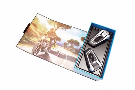 The box opens up at the front to reveal both PackTalk Bold units and a picture of a man riding a motorcycle.