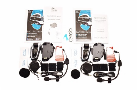 Inside the box you'll find the two PackTalk Bold units, plastic mounts with microphone and speaker connectors, 4 JBL speakers, 4 speaker covers, 2 boom microphones, 8 tape mounts, 4 alcohol cleaning pads, 2 microUSB cables, two company stickers, 2 installation guides and 2 pocket guides.