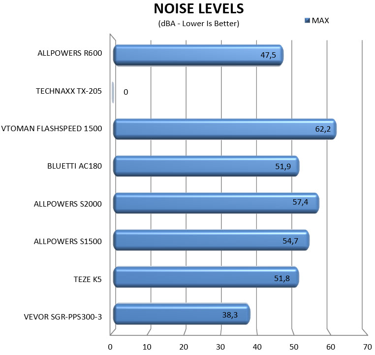 The R600 is the 3rd smallest portable power station I've received in the lab/office and well, it can't be really compared with the larger models, not just in terms of battery capacity but also power output. So, if you're looking for a power station capable of powering devices surpassing 300-400W for a significant amount of time the R600 model is simply not capable of that. On the other hand, the R600 is a great alternative to regular power banks since it easily surpasses most not only in battery capacity and power output but also available connectors (AC & DC support). On top of these you can also use a small solar panel to recharge the R600 when outdoors so if size (and occasional noise) is of no concern, it's the perfect replacement for large power banks. As for noise levels my sample was inaudible most of the time during testing, both while charging and while giving power to other devices. I only recorded noise a couple of times when things were getting very hot but again, for very short periods of time. I am pointing this out because Allpowers has made changes to the R600 lately and the speed profile of the internal fan seems to be among those changes.