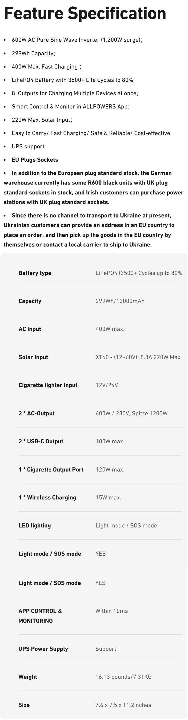 - Power Output (600W / 1200W Peak)