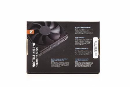The NH-L9i Chromax.Black gets shipped inside a black box that has a product picture at the front right beneath the product name and company logo.