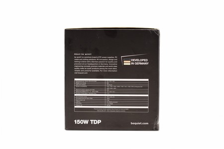 The specifications table is printed on the right side of the box right over the cooler's TDP and beneath a few words about be quiet!.