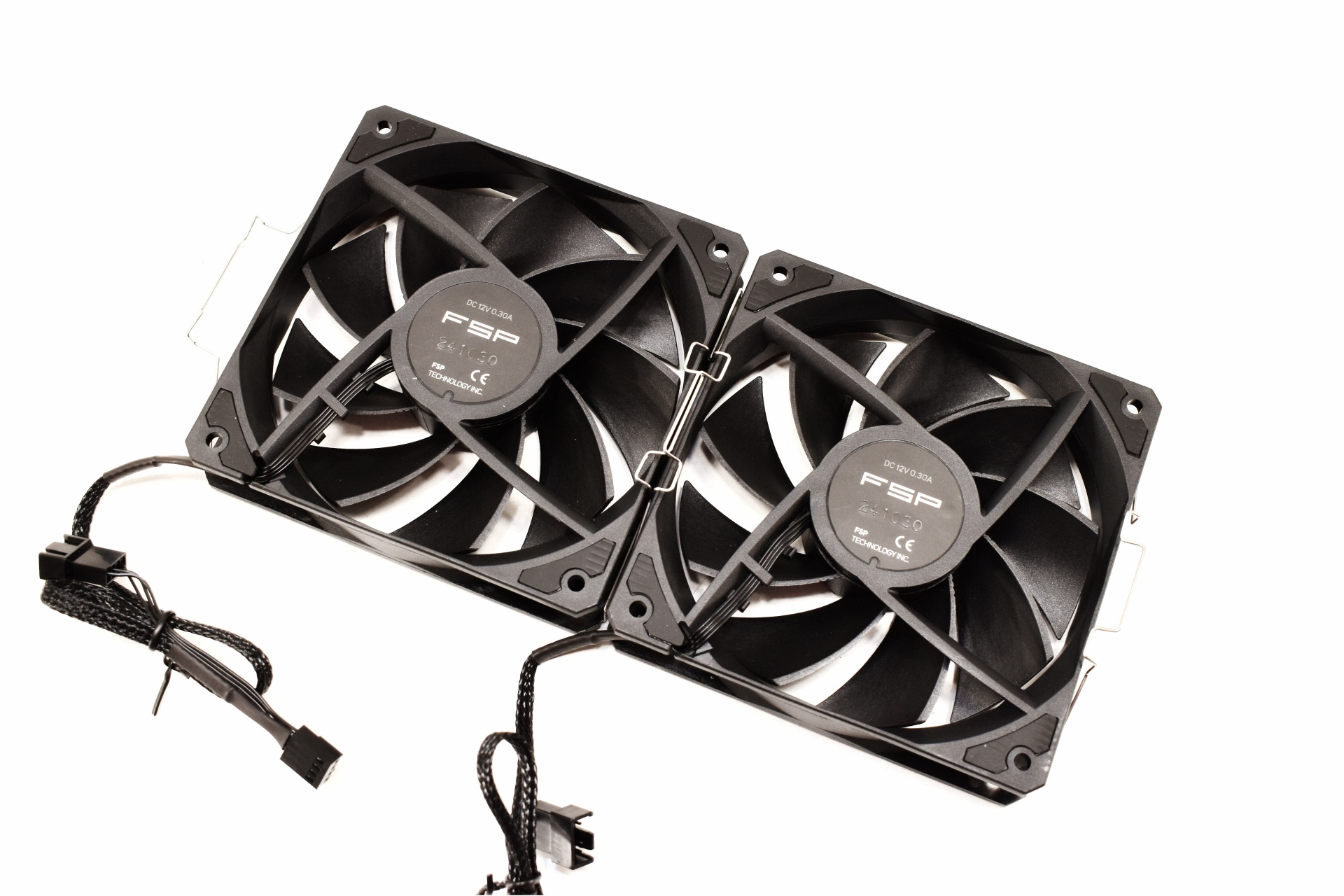 According to FSP the two 120mm fluid-dynamic bearing fans can reach speeds of up to 1800RPM to produce airflow levels of up to 76CFM with up to 2.1mmH2O static pressure and 32dBA noise.