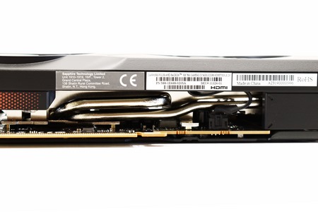 Underneath the fans SAPPHIRE has placed a single aluminum fin heatsink with two nickel plated copper heatpipes passing through it.