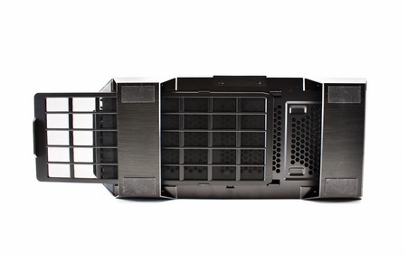 Turning the case around we find 3 vertical 2.5" aluminum drive trays, the PSU area with its 4 rubber feet and a plastic cover also placed vertically.