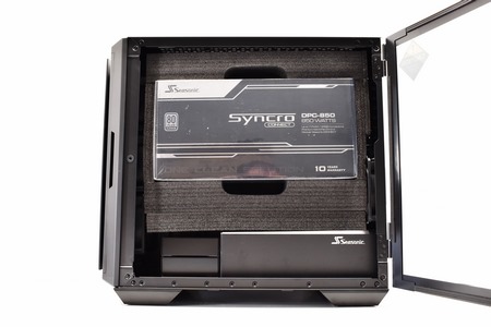Seasonic has placed 3 pieces of black foam in the SYNCRO Q704 and in turn the Syncro CONNECT DPC-850 inside those.