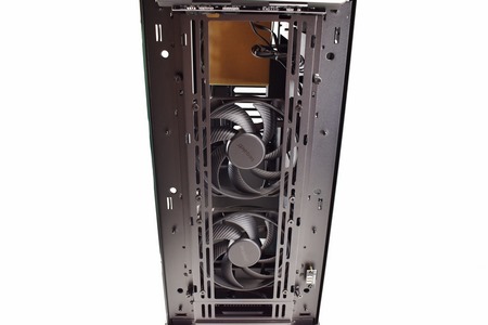 The plastic cover behind the fans can be removed either to install an 420mm radiator (will need to remove the drive cage underneath) or to install the angled and perforated plastic cover found in the bundle (redirects air towards the graphics card and CPU).