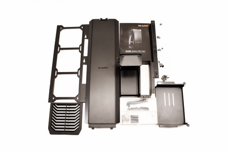 Aside the Dark Base Pro 901 inside the box be quiet! has also placed the side radiator bracket, 5.25" tray, 3.5" tray, VGA holder, perforated plastic panel, rear cable cover, plastic case with accessories (cable ties, rubber pads, screws), 5 small plastic bags with screws and spacers and the user manual.