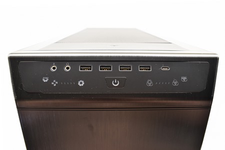 At the top we find the I/O which includes the on/off power button, touch buttons for the speed of the fans and the ARGB LED strips, 4 USB 3.2 ports, USB 3.2 Gen2 Type-C port and the typical 3.5mm ports.
