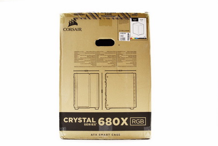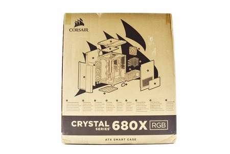 CORSAIR packs the CRYSTAL 680X RGB inside a plain cardboard box that has a product drawing at the front right over the product name and next to their logo.
