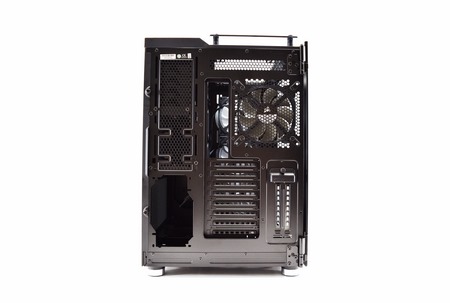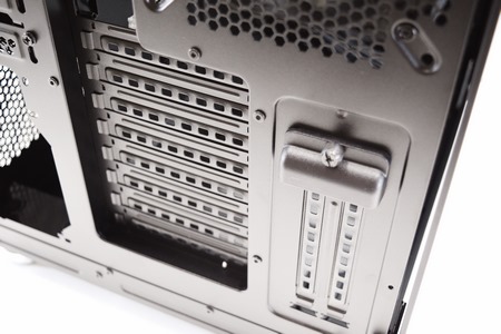 Moving at the rear of the case we find a regular (non LED) 120mm exhaust fan, 10 PCI expansion slots, perforated section (for the drives inside) and the PSU area.