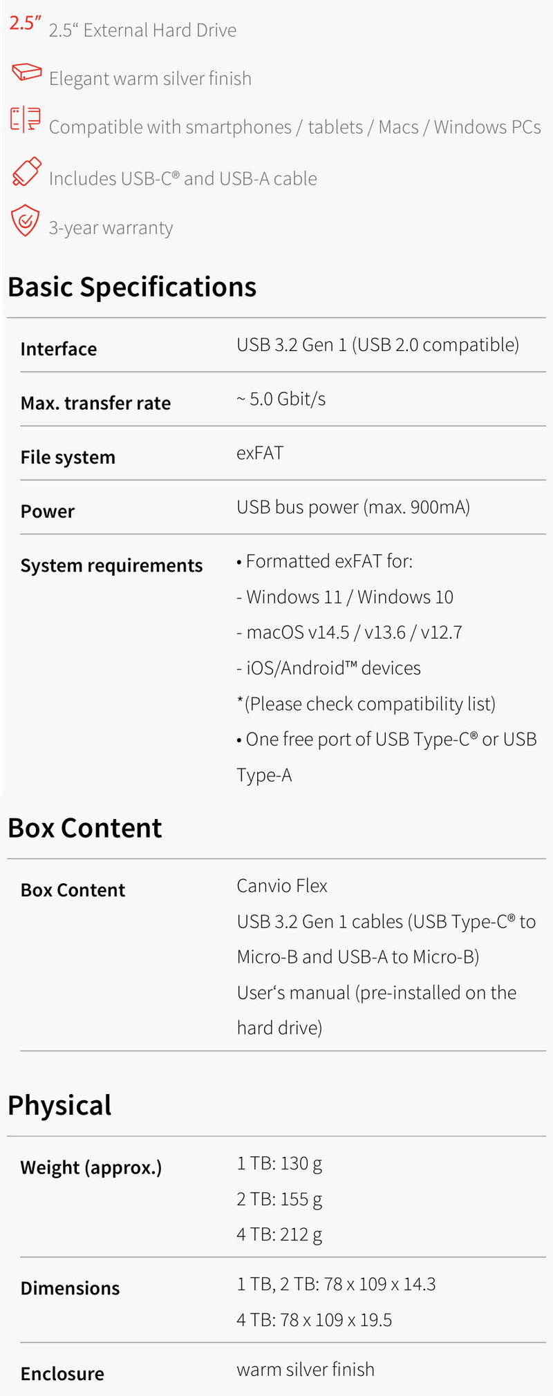 Toshiba released the very first version of their Canvio Flex drives back in 2020 (HDTX1x) and since it was quite popular among consumers, they decided to refresh the line thus releasing a new version in January 2025 (HDTX2x). Both lines featured 1/2/4TB capacities with USB 3.2 Gen 1 connectivity and as for differences between them we have an redesigned enclosure (only in silver color this time over) with an blue activity LED that stands out more, compatibility with smartphones and tablets due to its USB-C connector (compatibility list is available here) and as for the USB controller itself it now sports an always on mode for faster access when used (don't know what specific 2.5" drive the 2020 version used inside so I can't compare it with the MQ04UBB400 used in the newer version - probably the same in both models however). Finally, as always Toshiba covers the entire Canvio Flex line with a 3-year limited warranty.