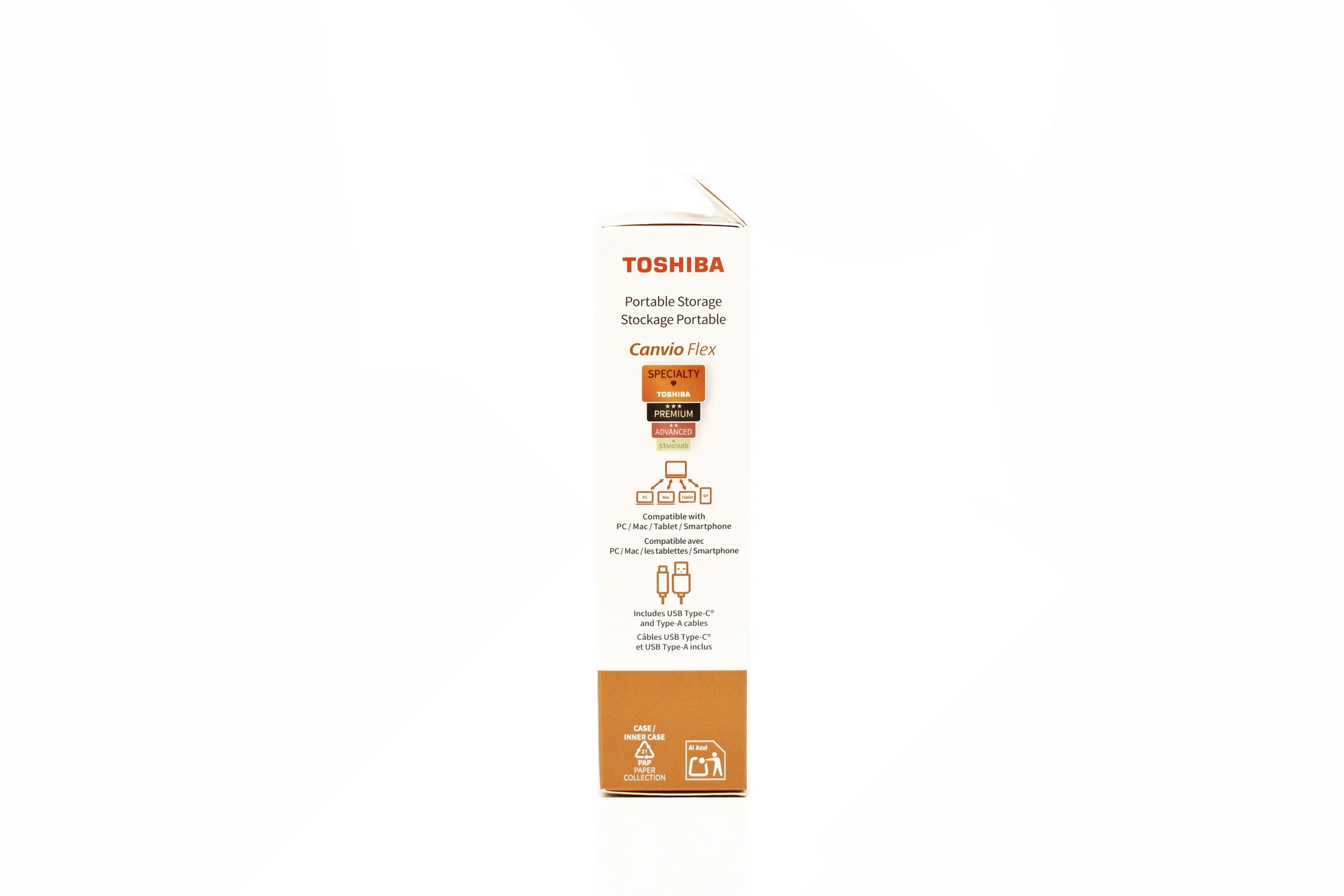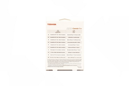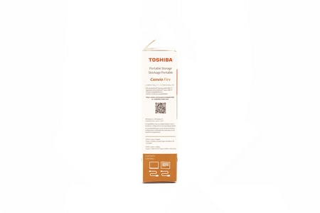 Toshiba uses a small white box at the front of which they've placed a product picture, their logo, capacity and connectivity.
