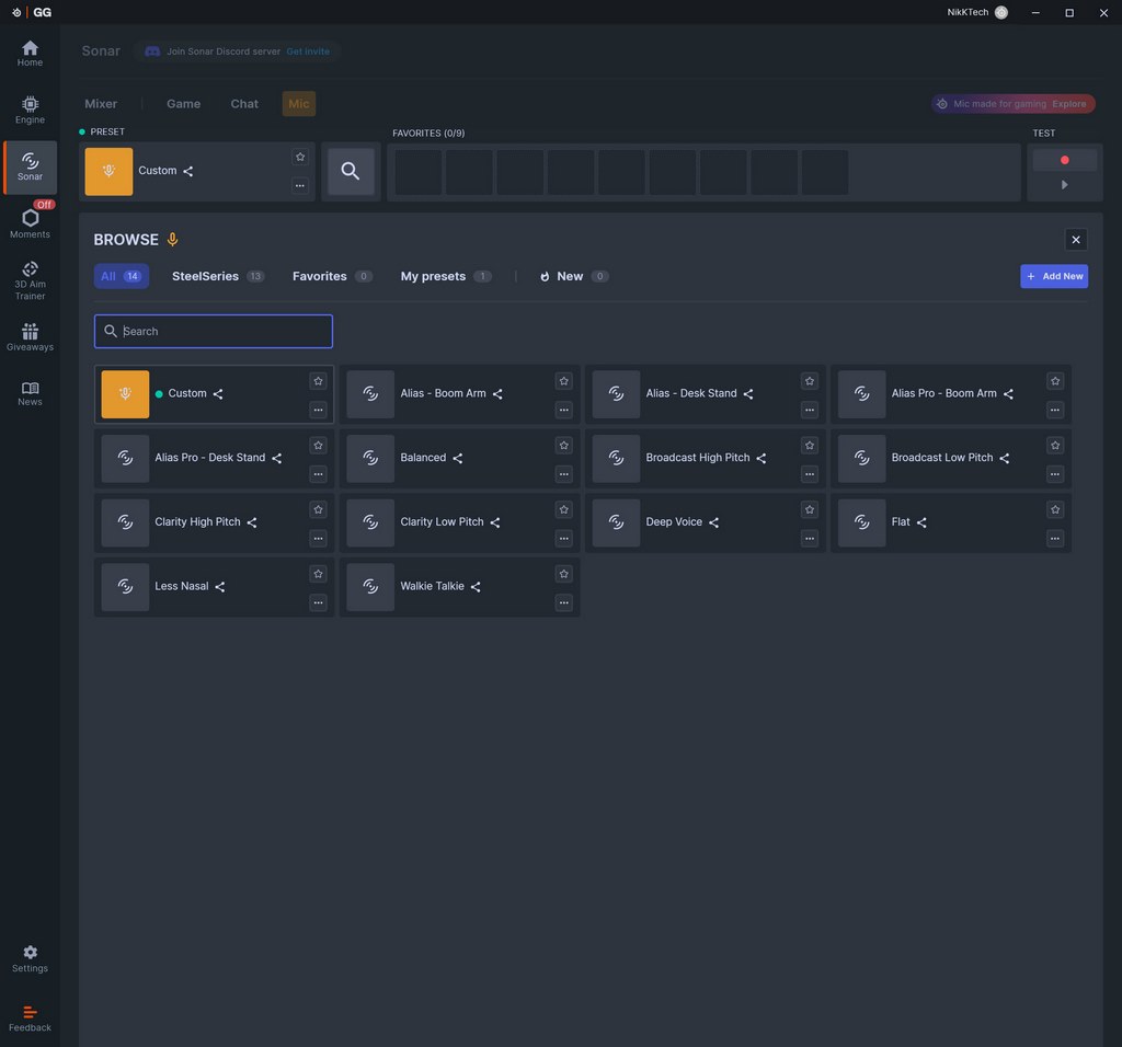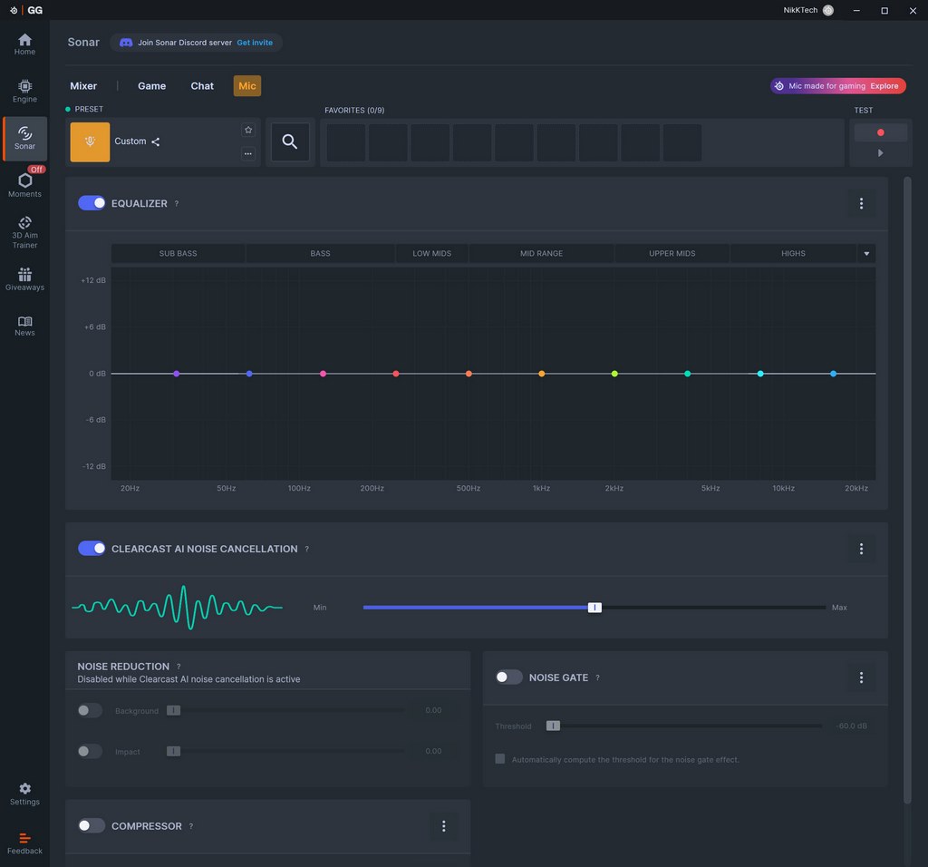 The mic tab is very similar to the chat one so again from here you can access the equalizer function (14 presets), noise cancellation, noise reduction, compressor, and noise gate.
