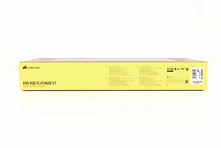 A large product picture is located at the front of the black and yellow box right next to a sticker with the keyboard layout and the company logo.