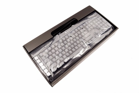 The keyboard is wrapped inside a plastic bag and placed in an extension of the box.