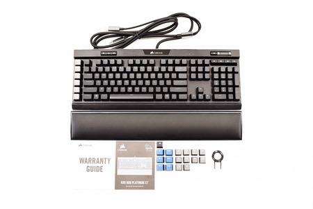 Along with the K95 RGB Platinum XT Mechanical Gaming Keyboard and its detachable cushioned leatherette palm rest you are also getting FPS and MOBA keycap sets, S-key keycap set, keycap puller COSAIR logo keycap, warranty paper and the quick start guide.