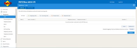 From the Telephony drop-down menu, you can check the calls list (incoming/outgoing numbers complete with time and duration), perform calls from the click to dial page, setup the answering machine, access stored telephone numbers, setup the phone (or phones) as alarms (3 in total), setup the fax function, handle/redirect all incoming calls and finally you can adjust your device and numbers settings.