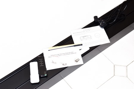 Along with the S ALR Motorized Tension Floor Rising Obsidian model and its power cord VIVIDSTORM also packs an RF remote with a wall mount, IR remote with a wall mount and an IR adapter, height adjustment plastic rods (default height is max), wireless projection trigger with its manual (still in beta phase - you can plug that into your projector so when it turns on/off the screen automatically extends/retracts), 4 screws (for the 4 legs of the base if you need to further secure it) and the user manual.